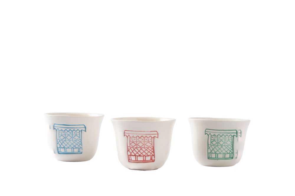 كوب "روشان": هذا الكوب مستوحى من التراث العربي الإسلامي والفن المعماري الحضري. تم تصنيع كوب القهوة من السيراميك ويتميز بالرمز التراثي المعماري الشهير "الروشان" بألوان عصرية.