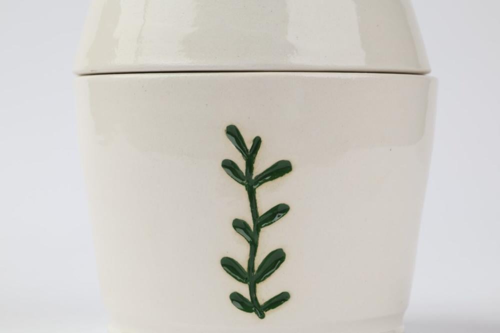 جرة خزفية ذات غطاء محكم تعكس روح الحرفة السعودية في أبهى صورها. مصنوعة من الطين الإيطالي الأبيض ومنقوشة يدويًا بزخارف نبتة المورينغا المستوحاة من البيئة المحلية، مع تطعيمات باللون الأخضر ولمسة نهائية لامعة تجعلها مثالية كقطعة تراثية وظيفية تُزيّن أي مكان بذوق رفيع.