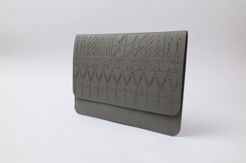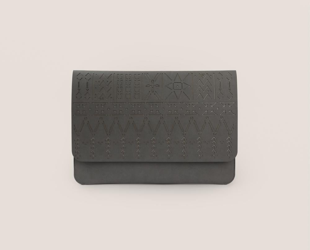 تجمع هذه الحقيبة بين الوظيفة والأصالة، حيث استُلهم تصميمها من الزخارف التراثية لمنطقة عسير، ونُفّذ بدقة على سطح جلدي أنيق ليحاكي روح الحرف المحلية .