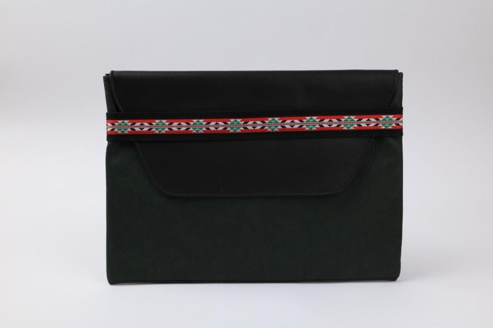 حقيبة لابتوب طويق مصنوعة يدويًا من الجلد الفاخر باللونين الأسود والزيتي، وتزينها لمسات من النسيج المزخرف بالنقوش النجدية الأصيلة. تصميم يجمع بين العملية والهوية الثقافية، ليمنحك قطعة تعكس أصالة التراث بلمسة عصرية أنيقة.