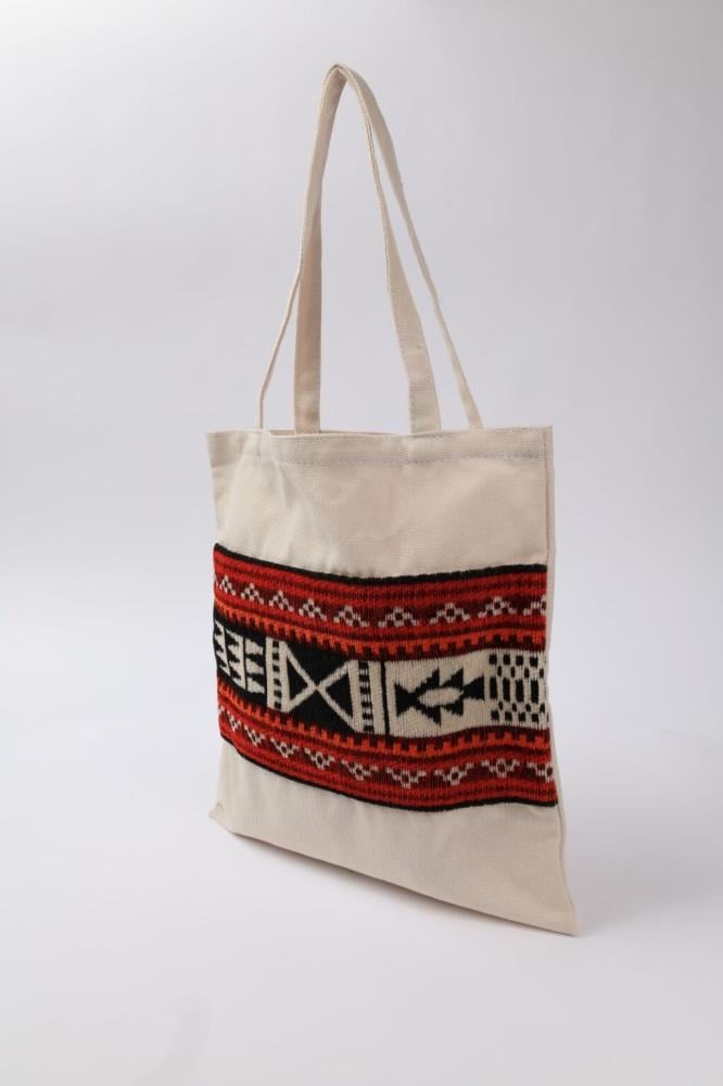 حقيبة قماشية بتصميم يجمع بين العملية والهوية التراثية. صُنعت يدويًا بإضافة منسوجات السدو التقليدية المحاكة بعناية، لتعكس جمال الحرف السعودية الأصيلة وتمنحك قطعة فريدة تعبّر عن ذوقك وثقافتك. المواصفات: الخامة: قماش قطني + سدو محاك يدويًا اللون: متعدد الألوان تنفيذ: مساوى احمد محمد كاسب منتج عالي الجودة من اختيار شركة حرف السعودية