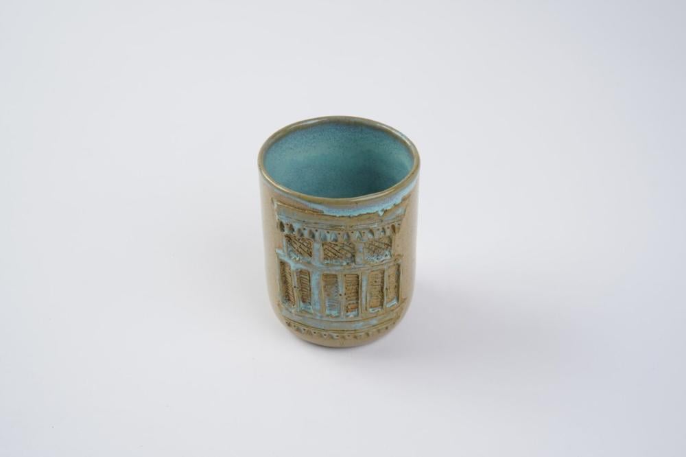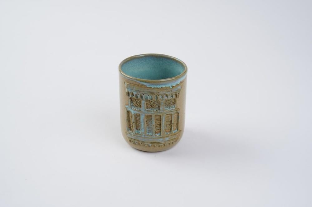 إبداع حجازي يعكس جمال العمارة التقليدية برواشينها المميزة، منفذ يدويًا على كوب ترابي اللون، وتزينه لمسات فيروزية نابضة بالحياة.