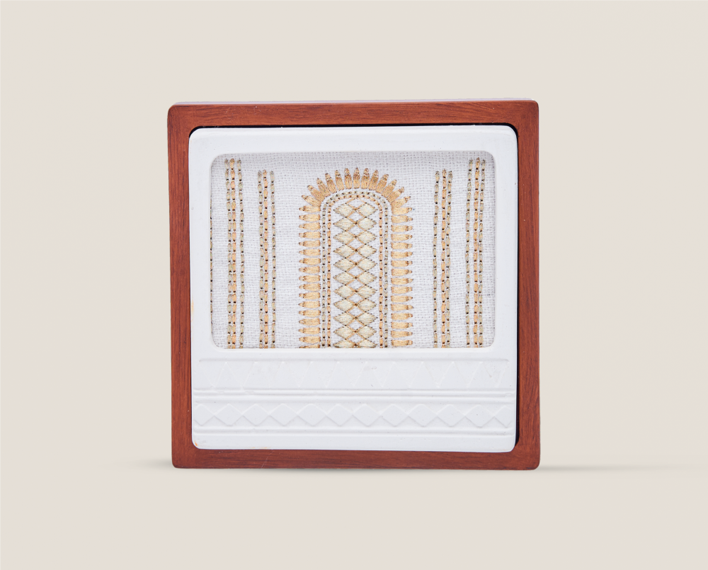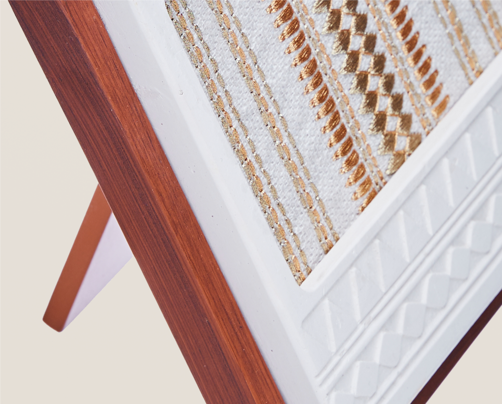 تشكلت لوحتنا بأيدي حرفيين سعوديين مبدعين، استخدموا التطريز والنقوش على الجبس من خلال النحت.