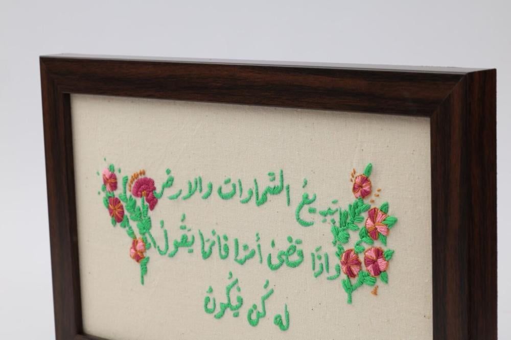 تطريز يدوي بعبارة قرآنية من سورة البقرة، "بديع السماوات والأرض وإذا قضى أمرًا فإنما يقول له كن فيكون"، محاط بزخارف زهرية ملونة تضيف روحًا من السكينة والتأمل. يجسد العمل قدرة الله وإبداعه المطلق في الكون، ويمنح المشاهد شعورًا بالطمأنينة والاتساع. صنع بأيدٍ سعودية ماهرة المواصفات: تنفيذ: الفنانة: لجين إبراهيم عفاشة الخامة: خشب + قماش مطرز منتج عالي الجودة من اختيار شركة حرف السعودية