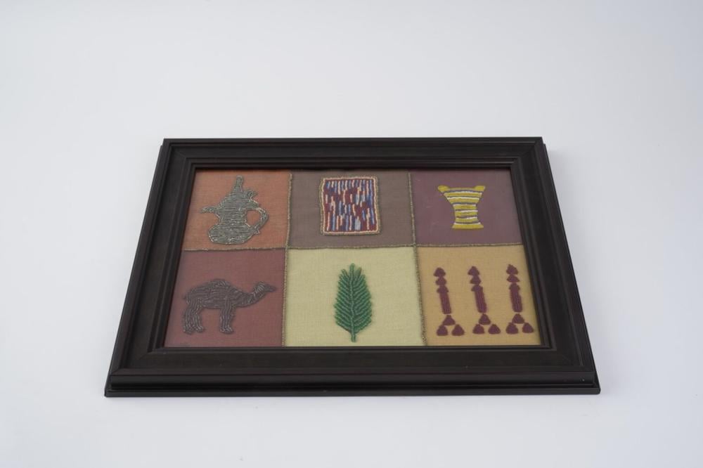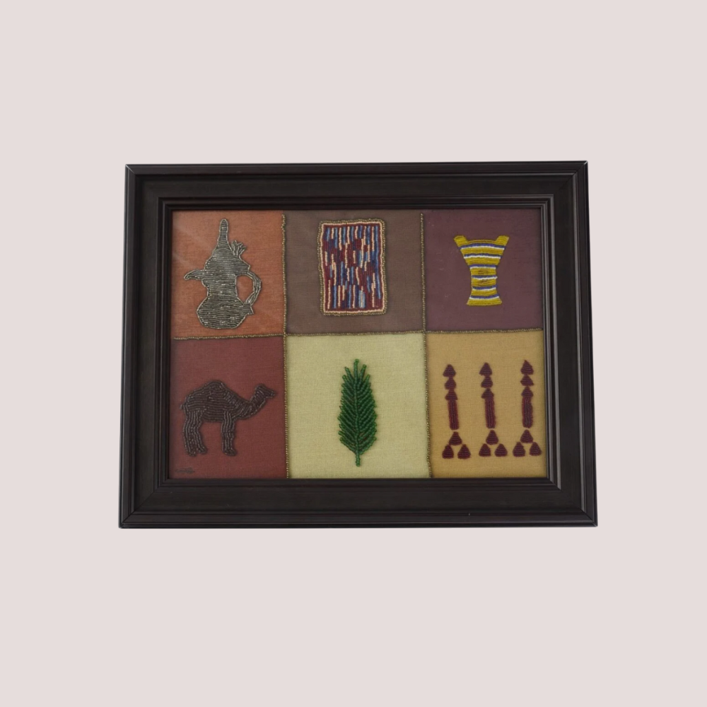 قطعة فنية فريدة مصنوعة يدويًا بدقة باستخدام الخرز، تتميز بتصميم تراثي يجمع بين الرموز الشعبية مثل الدلة، النخلة، الجمل، والمباخر. كل جزء مرسوم بالخرز يدوياً ويعكس حب وإتقان في الحرفة. اللوحة مقسّمة إلى مربعات ملونة، وكل مربع يحكي قصة من التراث. القطعة مؤطرة بإطار خشبي أنيق وجاهزة للتعليق، وتُعد إضافة مثالية لديكور المجالس، الصالات، أو زوايا البيت المهتمة بالفن الأصيل