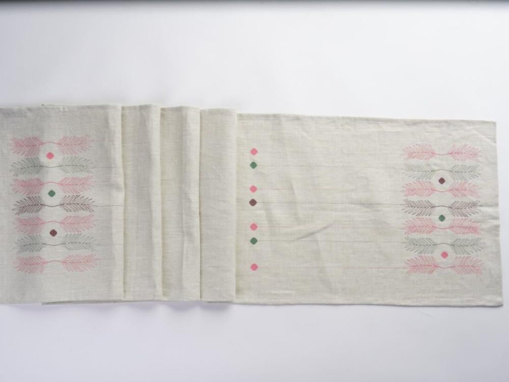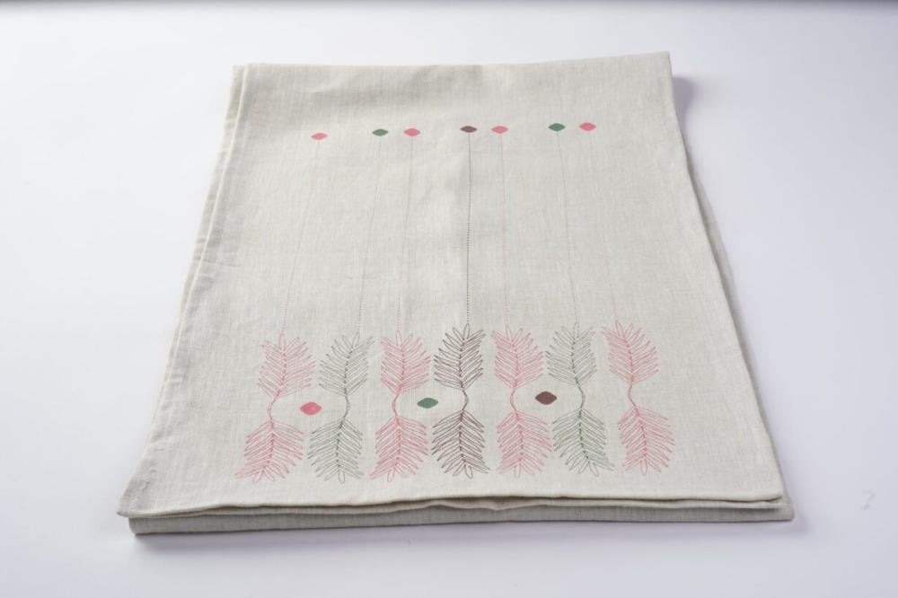 مفرش من الكتان مطبوع بتقنية الشاشة الحريرية، يزينه تصميم مستوحى من سعف النخيل في واحة العلا ليضفي أناقة تراثية على مائدتك.
