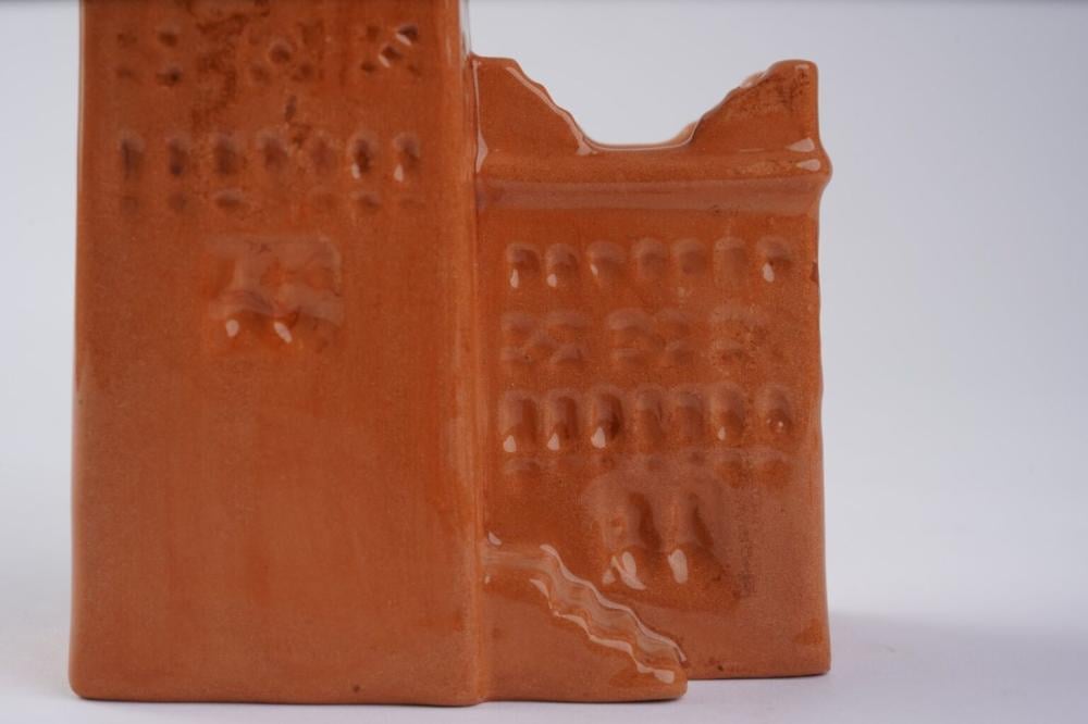 منظم مكتبي أنيق مصنوع من السيراميك، مستوحى من الطراز العمراني السلماني. عملي لترتيب الأدوات الشخصية أو المكتبية، ويمكن استخدامه أيضًا كتحفة ديكور أو مزهرية صغيرة تضيف لمسة جمالية.