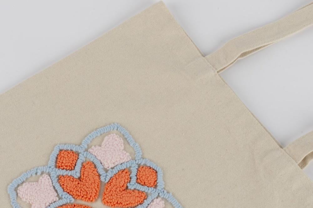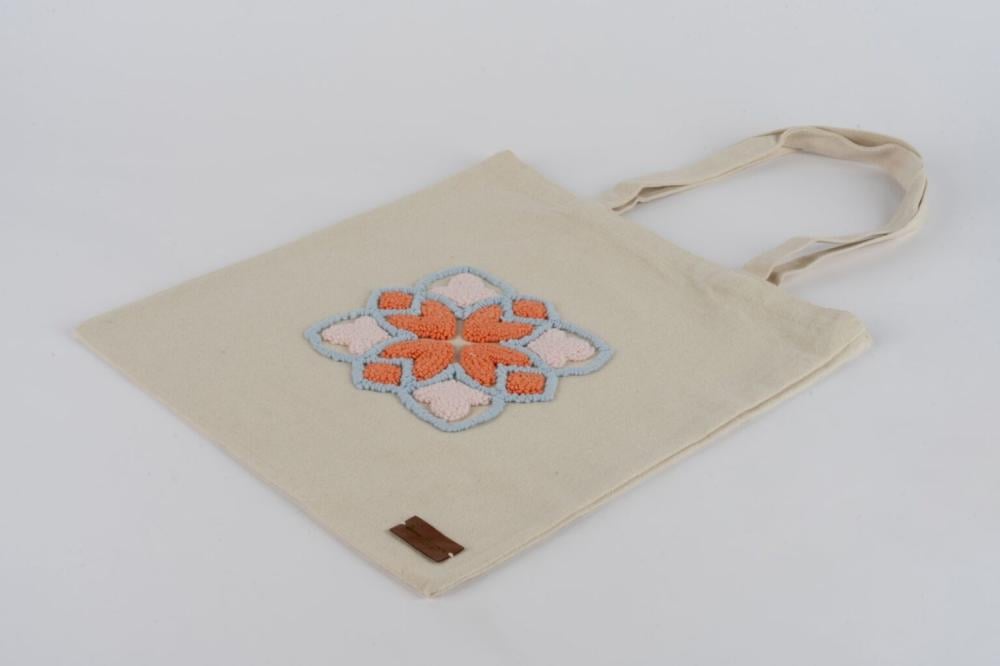 A fabric bag in elegant beige, featuring hand embroidery that reflects the beauty of traditional geometric motifs. Soft threads and harmonious colors add an artistic touch to everyday use.