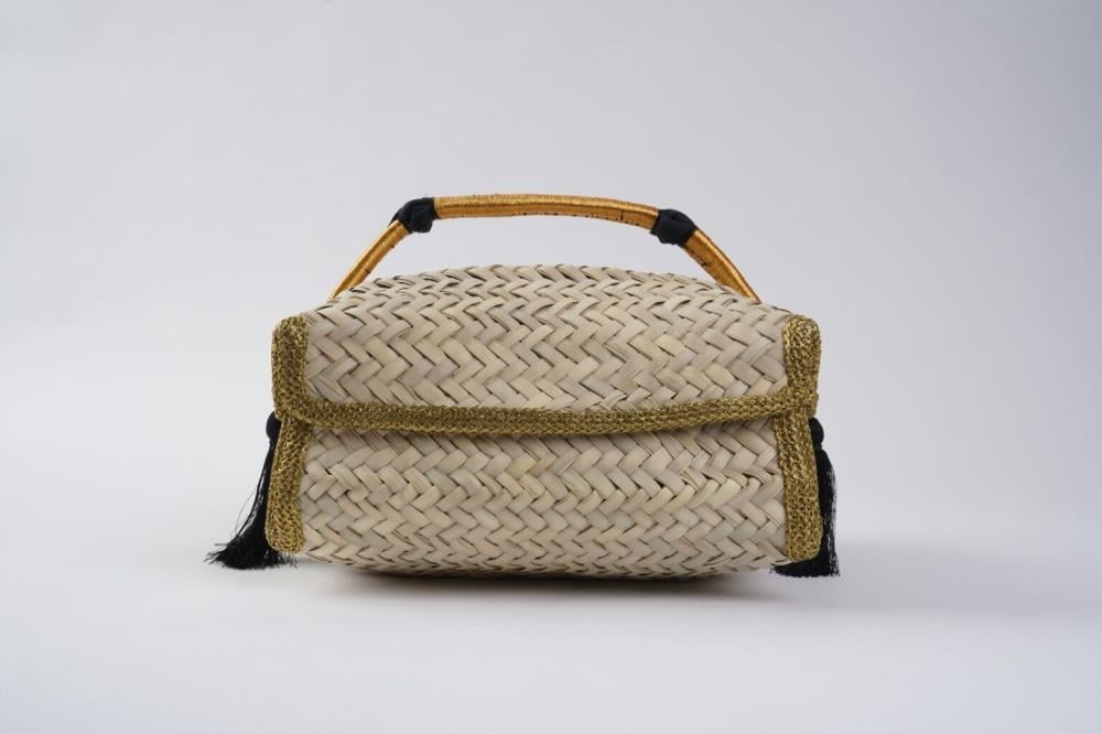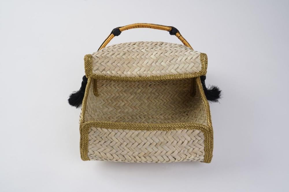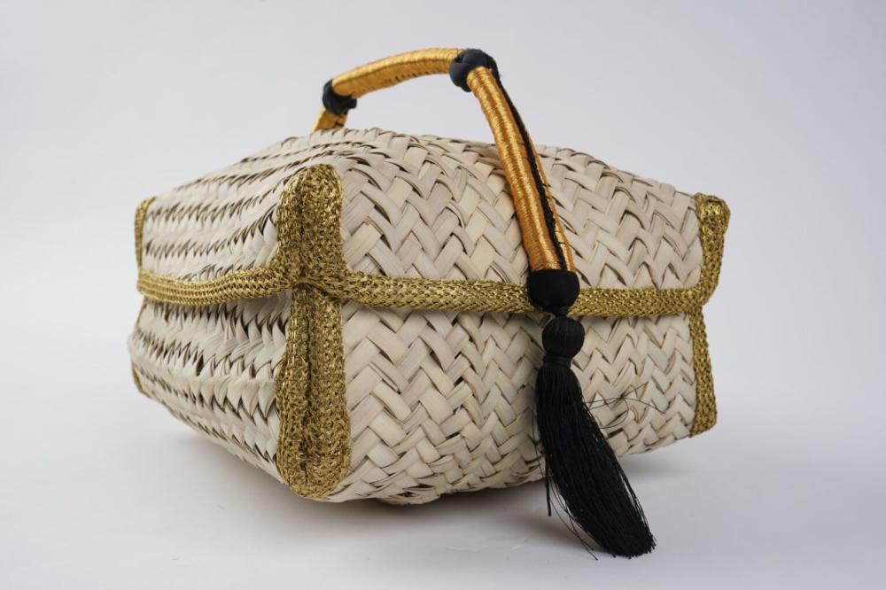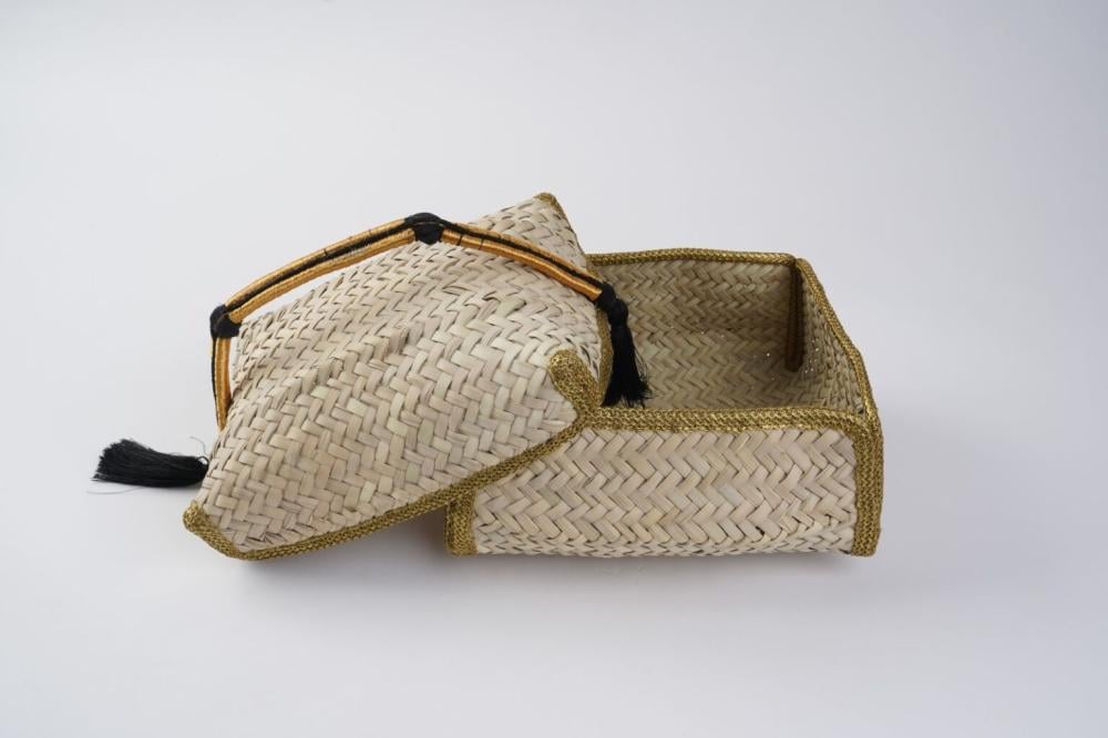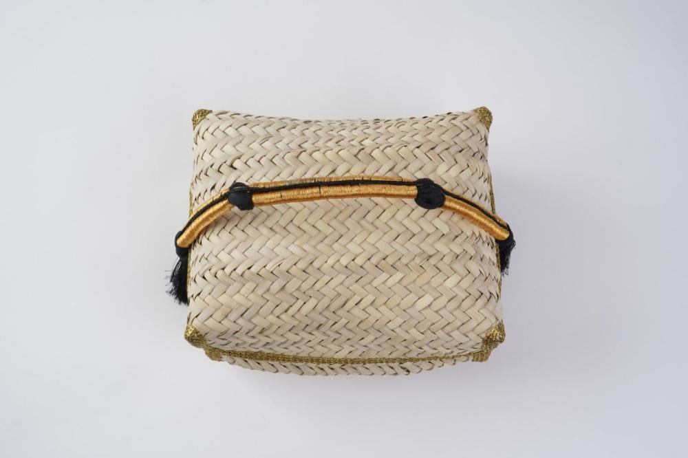 An elegant box woven from natural palm leaves and adorned with golden threads, adding a touch of luxury and sophistication. This piece combines Saudi tradition with modern design, making it perfect for storing your belongings or presenting as a refined gift.
