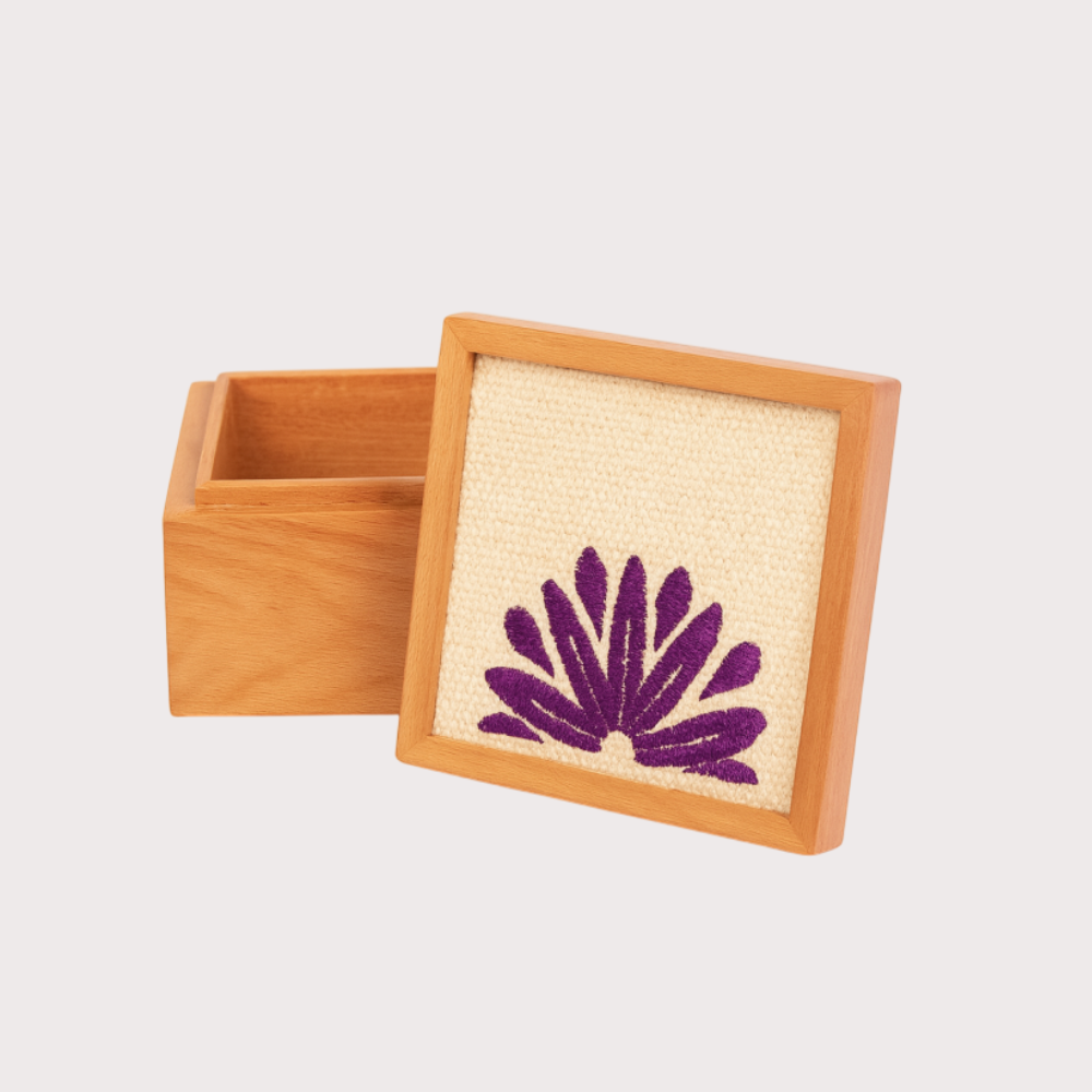 An elegant wooden box with a handcrafted embroidered lid featuring a design inspired by the famous Tabuk flower in its enchanting purple hue. This piece combines tradition and modernity, serving as a practical and decorative item that preserves your belongings while adding a touch of Saudi identity with a renewed spirit.