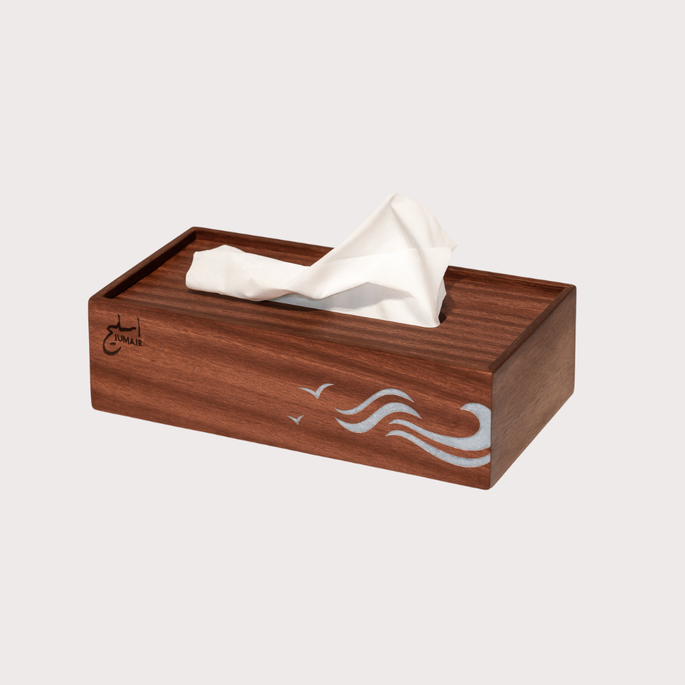 An elegant wooden tissue holder adorned with natural mother-of-pearl inlay, inspired by the traditional Umluj window and featuring details of the sea and birds. Carefully crafted to bring a touch of authenticity and refined taste to your home or office, combining functionality and artistic beauty in a single piece.