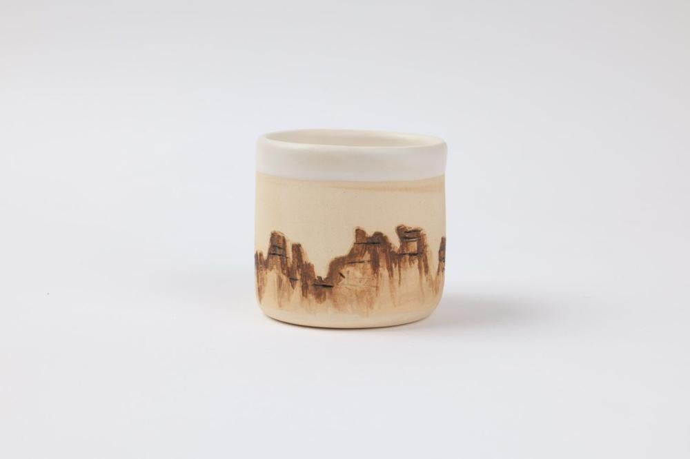 Echoing the raw beauty of the Sharaan Reserve, the White Sharaan Cup is handcrafted from fine pottery in a naturally asymmetrical form. Featuring ruffled paint at the base and detailed engravings of camels and desert landscapes, it’s a unique fusion of artistry and everyday utility.